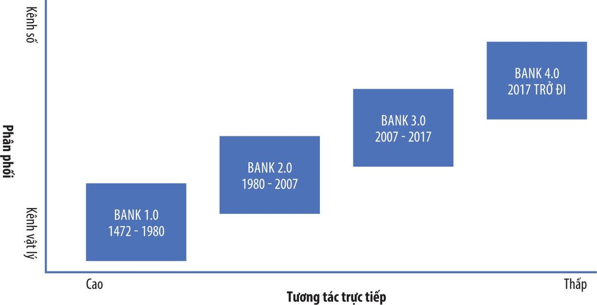 Trong đó, Bank 1.0 là mô hình đơn giản nhất, hoạt động ngân hàng theo hướng lịch sử, tập trung lấy chi nhánh là điểm tiếp cận chính. Bank 2.0 là hệ thống ngân hàng tự phục vụ, nhằm cung cấp các dịch vụ ngoài khung giờ làm việc của ngân hàng, bắt đầu với máy ATM và tăng tốc với sự ra đời của Internet.