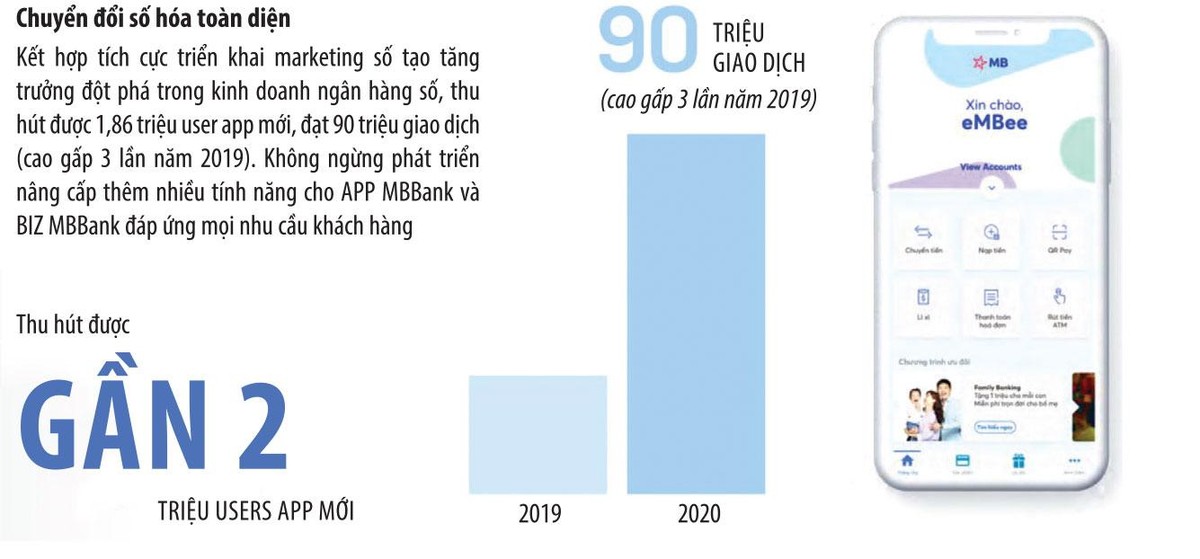 Trong năm 2020, ứng dụng số của MBB thu hút gần 2 triệu người dùng mới và số giao dịch qua app đạt 90 triệu lượt, cao gấp 3 lần năm 2019. Điều này củng cố vị trí dẫn đầu về ngân hàng số của MBB, điều mà ngân hàng này dự kiến sẽ tiếp tục là một trong những mục tiêu quan trọng trong năm nay.