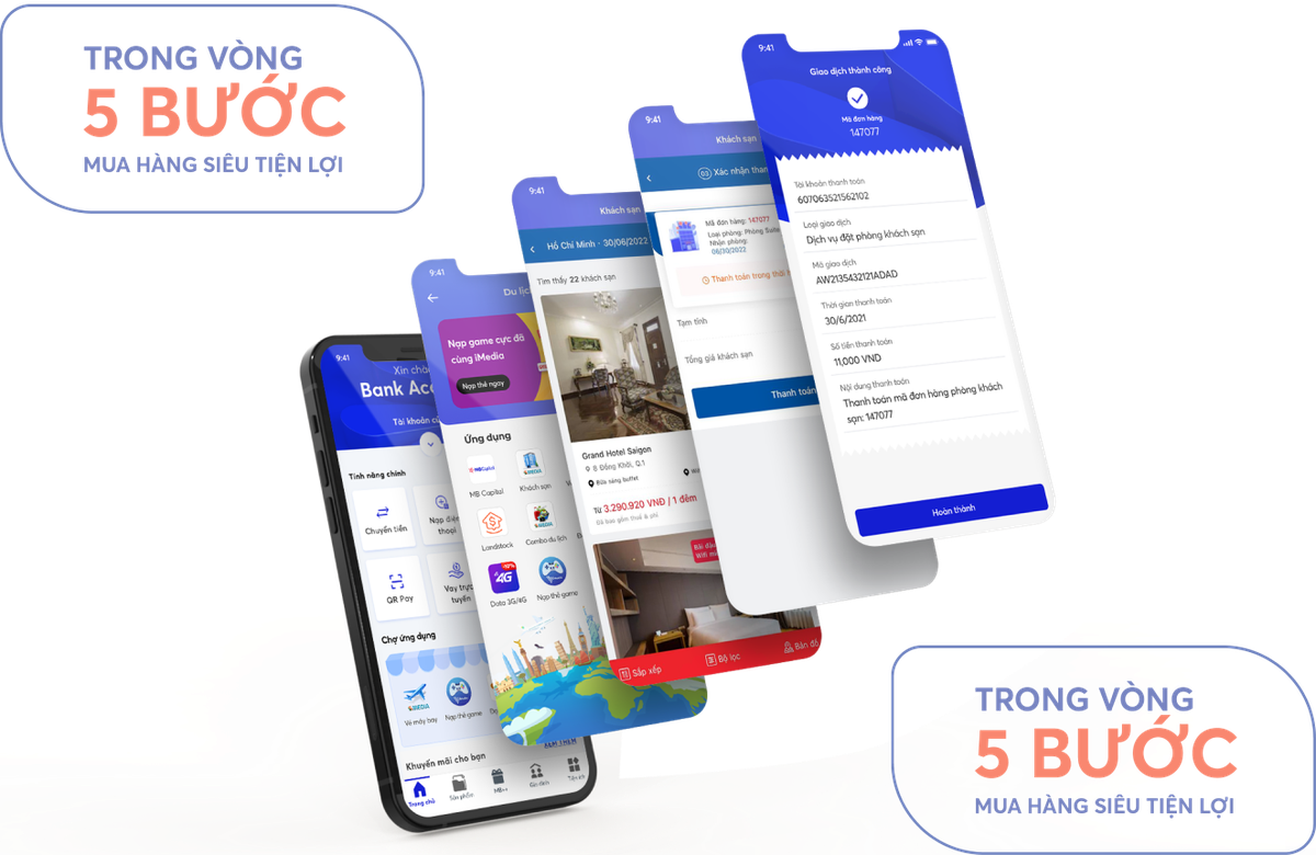 Thấu hiểu về hành vi người dùng thông qua phân tích dữ liệu, chuyên gia công nghệ của MB giúp người dùng tiếp cận đúng dịch vụ, đúng thời điểm và đúng nhu cầu. Chỉ bằng một vài thao tác đơn giản, người dùng App MBBank có thể hoàn tất thao tác mua sắm online, di chuyển, đặt vé máy bay, đặt khách sạn, ship hàng, mua voucher giải trí, ẩm thực… cùng hệ thống thanh toán bảo mật hàng đầu tại Việt Nam.