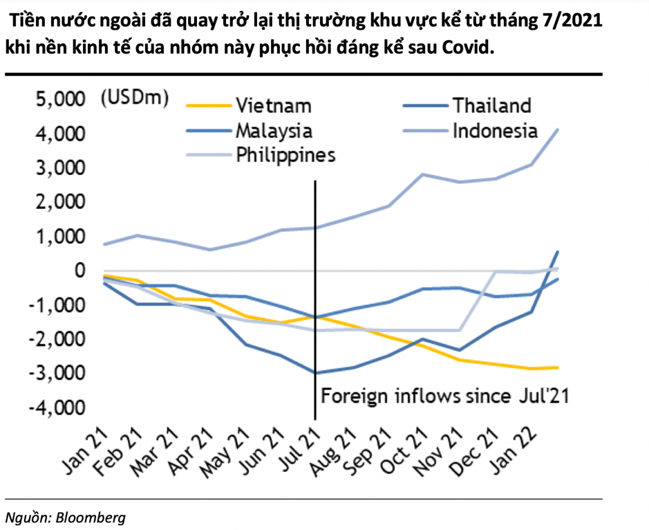 Trên thực tế, dòng tiền nước ngoài sẽ sớm quay trở lại Việt Nam bởi sự phục hồi của nền kinh tế sau đại dịch. Khối này đã mua ròng 21 triệu USD vào tháng 2/2022, lần đầu tiên kể từ tháng 7/2021.