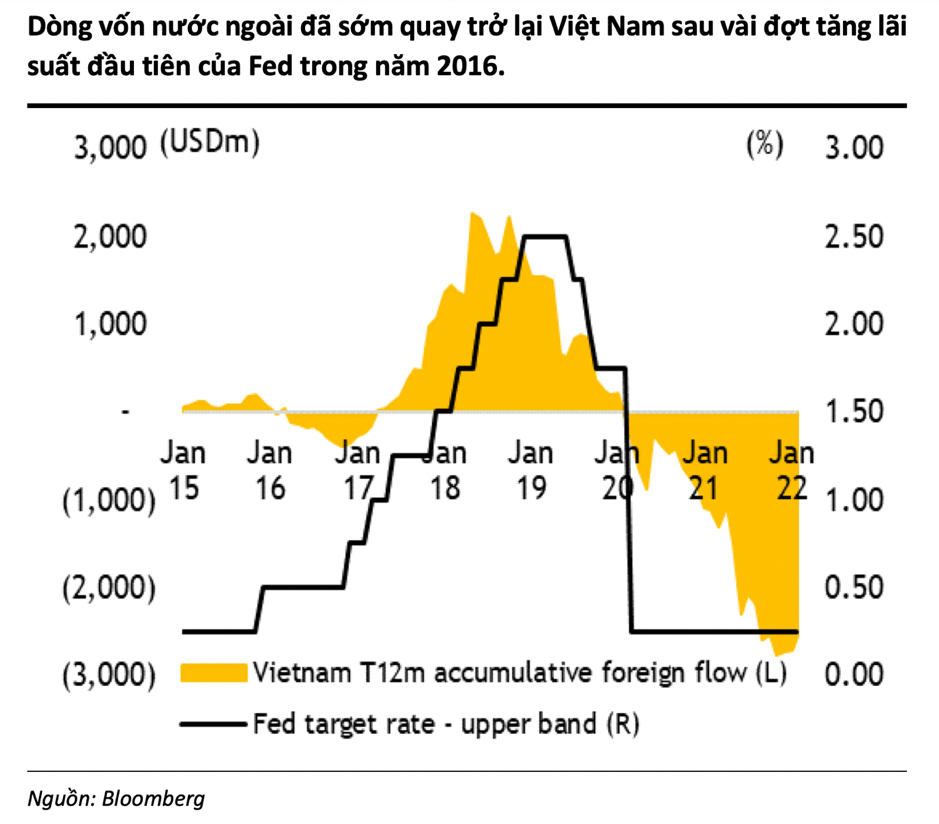 Khối ngoại có thể sẽ rút khỏi Việt Nam trong thời gian ngắn như năm 2016 khi Fed bắt đầu một loạt các đợt tăng lãi suất. Tuy nhiên, áp lực bán sẽ không đáng kể vì nhóm này đã bán ròng 2,5 tỷ USD trong 12 tháng qua.