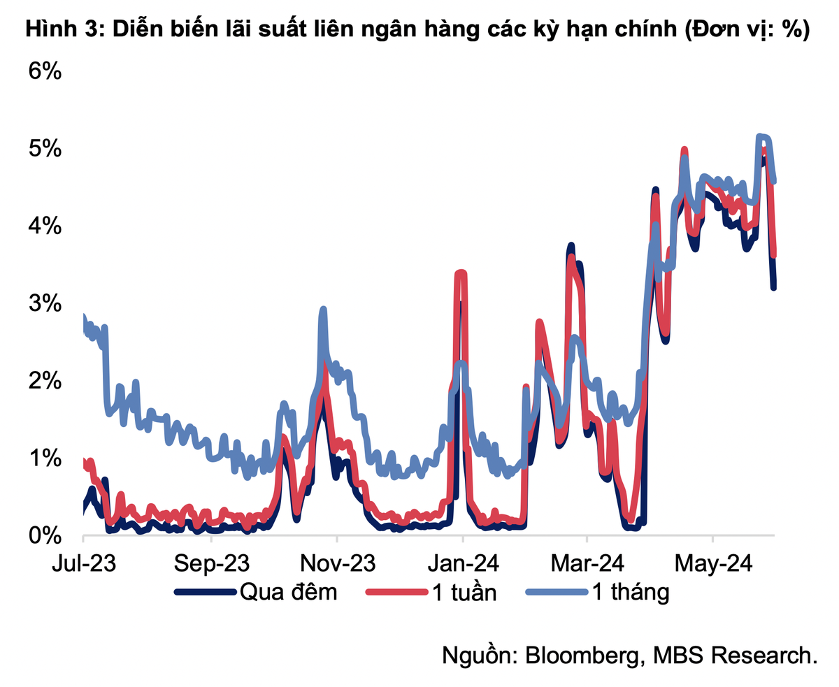 Các chuyên gia MBS dự kiến lãi suất liên ngân hàng sẽ tiếp tục duy trì ở mức cao trong bối cảnh cung tiền VND giảm khi NHNN vẫn ưu tiên mục tiêu kiểm soát và bình ổn thị trường vàng và ngoại tệ.