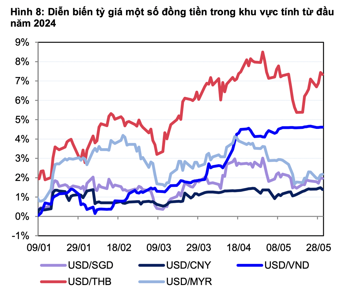 Trong nước, NHNN đã thực hiện các biện pháp ổn định tỷ giá như bán ngoại tệ nhưng đồng thời đẩy lãi suất liên ngân hàng tăng trong thời gian gần đây do cung tiền đã bị rút bớt và khiến thanh khoản thắt chặt hơn trong hệ thống. Tỷ giá USD/VND liên ngân hàng giữ vững ở mức 25.457 trong tháng 5, tăng 4,4% từ đầu năm. Tỷ giá trên thị trường tự do là 25.790 VND/USD, trong khi tỷ giá trung tâm là 24,261 VND/USD, tăng lần lượt 4,2% và 1,7% so với đầu năm 2024. Xu hướng giảm của VND vẫn khá tương đồng so với các đồng tiền khác trong khu vực, ví dụ như baht Thái (-6,9% từ đầu năm), Malaysia ringgit (-2,4%), Nhân dân tệ Trung Quốc (- 2,3%), và yên Nhật (-10,5%).