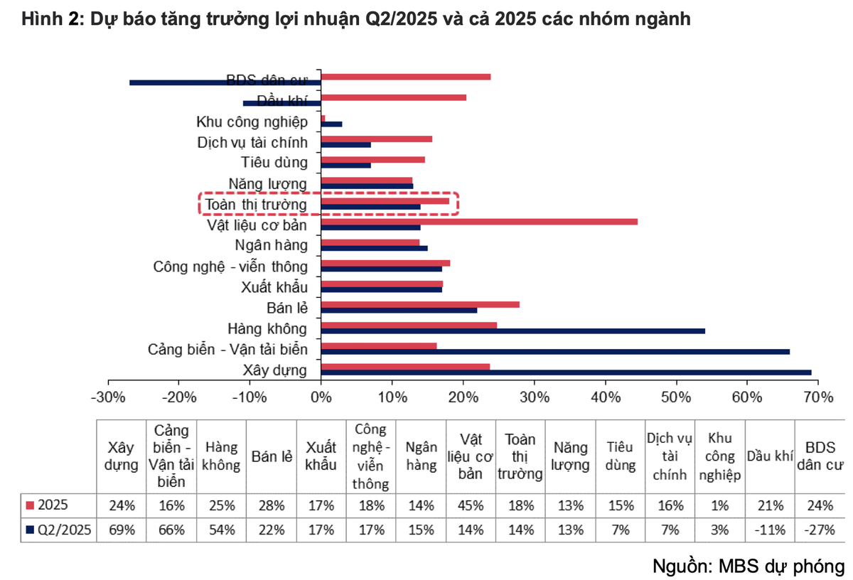 Ngành vật liệu cơ bản cũng ghi nhận mức tăng 14% với sự dẫn dắt của thép. Quý II/2025, sản lượng tiêu thụ thép trong nước dự kiến đạt 7,1 triệu tấn, tăng 22% so với cùng kỳ, nhờ lực đẩy từ đầu tư công và tín hiệu phục hồi của thị trường bất động sản. HPG có thể ghi nhận mức tăng 15% sản lượng thép xây dựng và 40% sản lượng HRC trong quý II.
