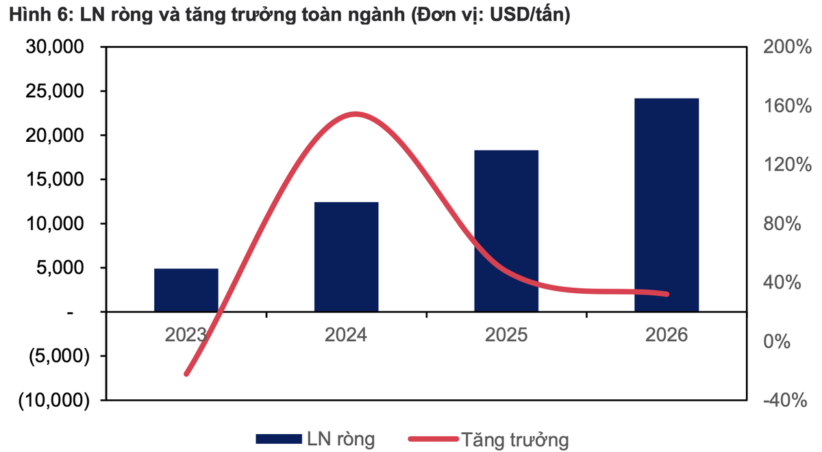 Cùng với đó, việc tích trữ tồn kho HRC giá rẻ giúp các doanh nghiệp tôn mạ sẽ tăng trưởng biên lợi nhuận gộp khoảng 0,7 - 1 điểm phần trăm so với cùng kỳ vào năm 2025 - 2026. Tổng hợp lại, biên lợi nhuận gộp toàn ngành dự báo tăng 1 và 0,5 điểm phần trăm trong giai đoạn 2025 - 2026; lợi nhuận toàn ngành thép trong giai đoạn này có thể tăng trưởng 47% và 32%.
