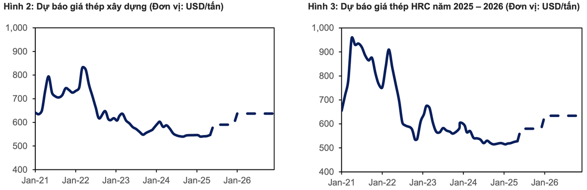 Vậy nên, giá thép xây dựng và HRC có thể tăng trưởng kể từ quý III/2025, cụ thể, trong giai đoạn 2025 – 2026, giá thép xây dựng có thể đạt mức 594 - 635 USD/tấn (tăng 6% - 7% so với cùng kỳ), giá HRC có thể đạt mức 575 - 605 USD/tấn (tăng 4% - 3%).