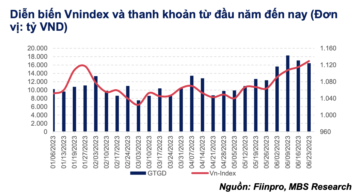 MBS dự báo, VN-Index hướng về vùng 1.155 - 1.200 trong nửa cuối năm 2023 trên cơ sở lợi nhuận của các doanh nghiệp niêm yết tăng 10% trong năm 2023 và định giá P/E thị trường trong khoảng 12 - 12,5 lần.