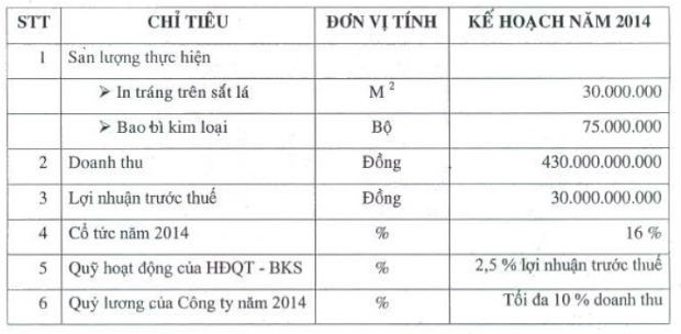 Theo đó, HĐQT đã thống nhất kế hoạch kinh doanh năm 2014 với doanh thu dự kiến 430 tỷ đồng, lợi nhuận trước thuế 30 tỷ đồng, cổ tức dự kiến 16%. Kế hoạch này so với thực hiện 2013 khá thận trọng.