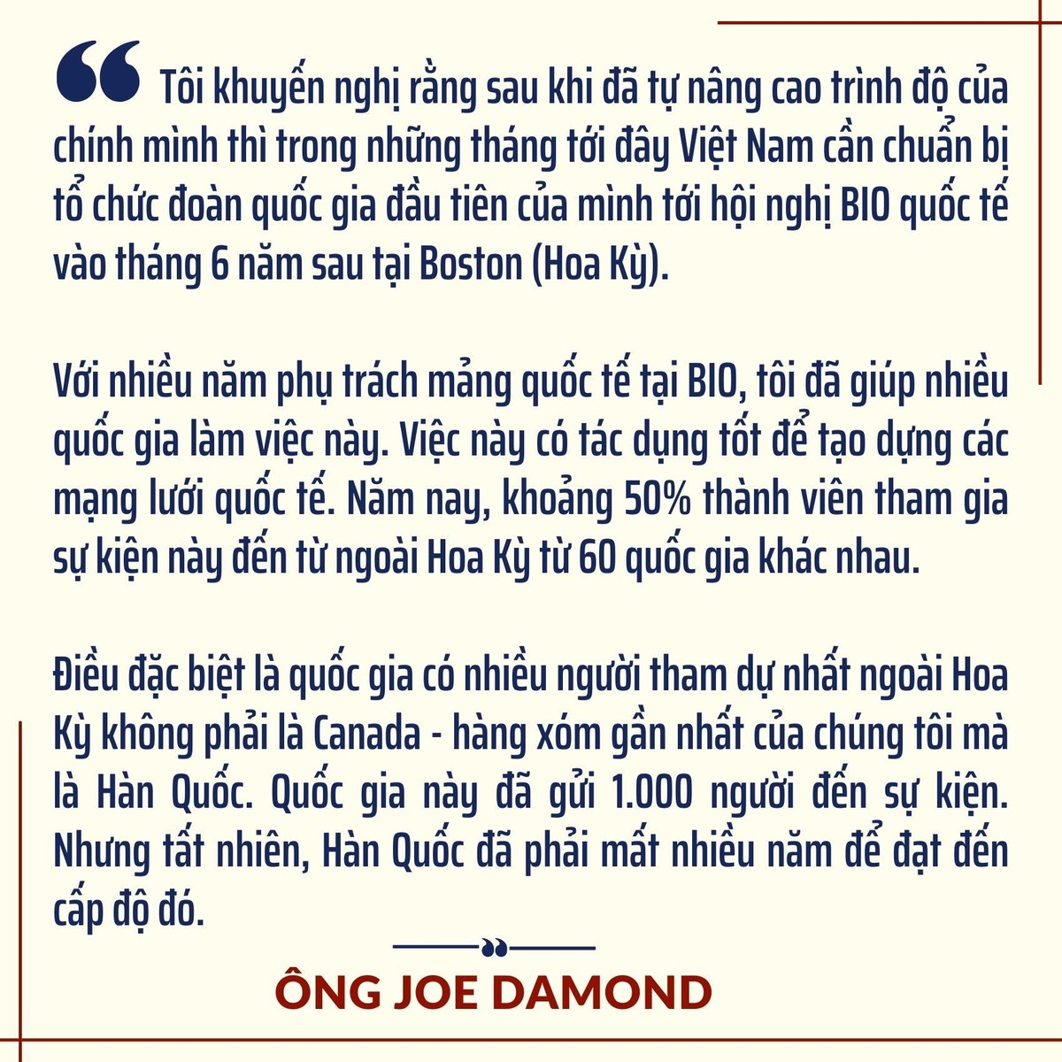 Hội nghị BIO năm tới sẽ diễn ra ở Boston vào tháng 6 năm 2023. Tôi hy vọng sẽ có một đoàn đại biểu cấp cao Việt Nam tham dự. Ở một hội nghị lớn như vậy rất cần thiết có một quan chức cấp Bộ trưởng tham gia để có thể đưa ra những thông điệp tinh tế, uy tín, có thể thu hút, hấp dẫn được các công ty, nhà đầu tư quốc tế, cũng như khẳng định là Việt Nam có lợi thế cạnh tranh và sẵn sàng tham gia tích cực.