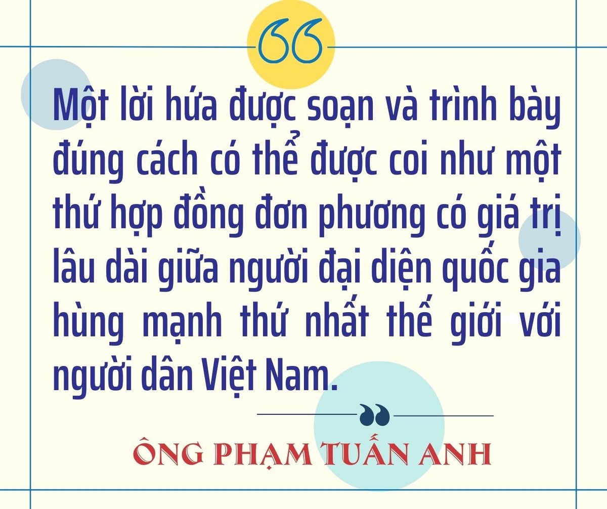 Nhiều năm về sau này, ngay cả khi Tổng thống Obama không còn tại vị nữa, tôi tin tưởng chắc chắn rằng, vào những lúc quan hệ hai nước có khó khăn, người ta có thể mang hai câu này ra để làm bằng chứng cho lời hứa trăm năm và người Mỹ trọng truyền thống và lời hứa ở cấp cao sẽ hành xử thích hợp với tinh thần của lời hứa đó.