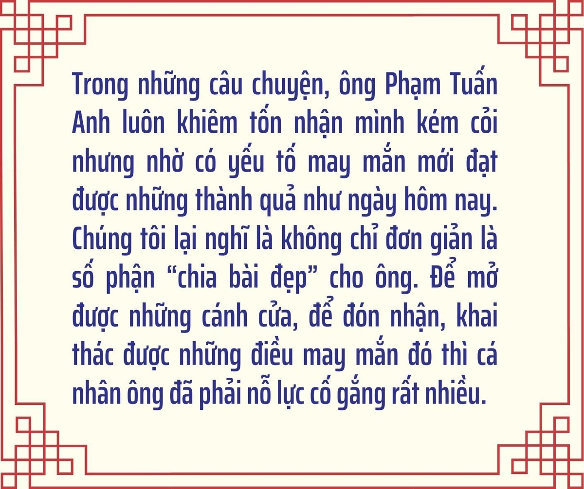 Chúng tôi đã có ba buổi trò chuyện kéo dài tổng cộng gần 10 tiếng với ông Phạm Tuấn Anh. Ông luôn tỏ ra khiêm tốn, nhã nhặn, lịch lãm thể hiện qua giọng nói ấm áp, truyền cảm. Chúng tôi bị cuốn theo mạch chuyện của ông mà nhiều lúc quên đi những câu hỏi chuẩn bị sẵn.