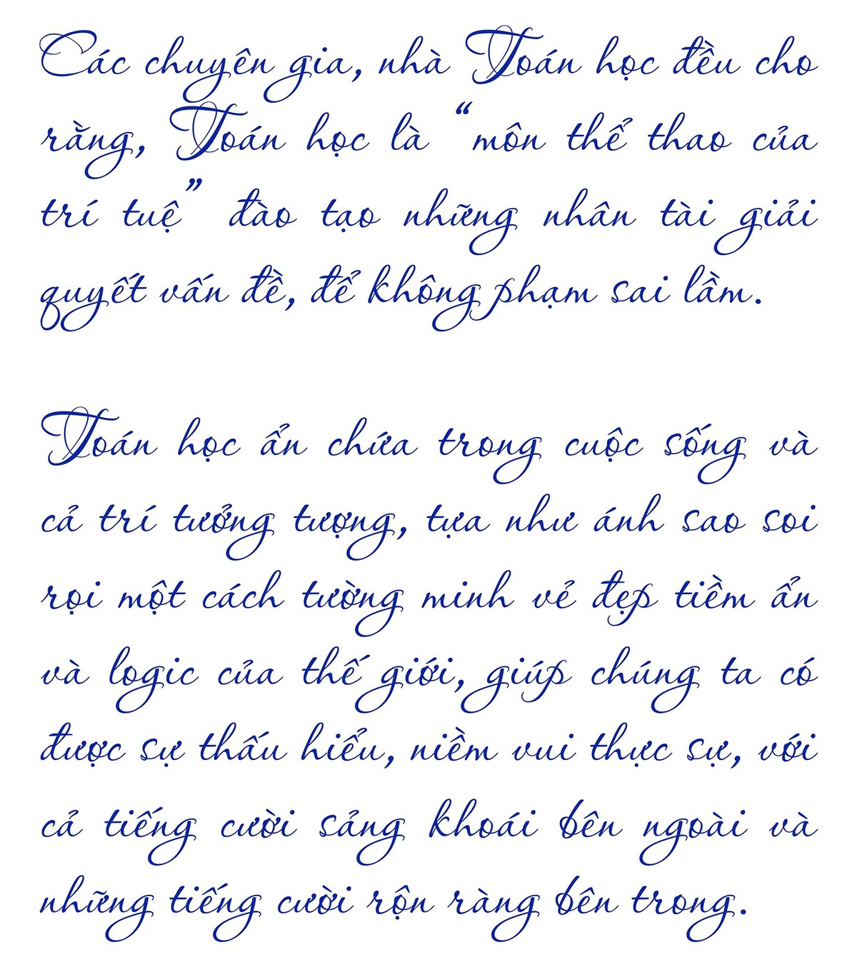 “Toán học sẽ khiến cho bạn có được sự thấu hiểu, niềm vui thực sự, với cả tiếng cười sảng khoái bên ngoài và cả những tiếng cười rộn ràng bên trong”, ông nhấn mạnh.