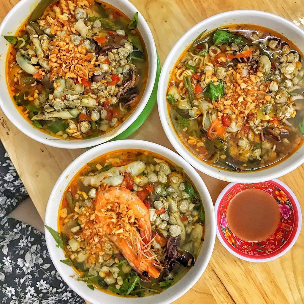 Mì ốc hến Dì Lan: Một sự kết hợp khá lạ trong ẩm thực TP.HCM, mì ốc hến gồm có mì gói chín vừa, ốc móng tay, hến, bạch tuộc, tôm... cùng với nước dùng đậm đà, tỏi phi và rau thơm. Không gian quán rộng rãi, thoải mái, món ăn này là sự lựa chọn tuyệt vời cho những ngày mưa lạnh. Quán có nhiều chi nhánh tại quận 4, 10, Gò Vấp cho bạn lựa chọn. Giá: 28.000-43.000 đồng/suất.