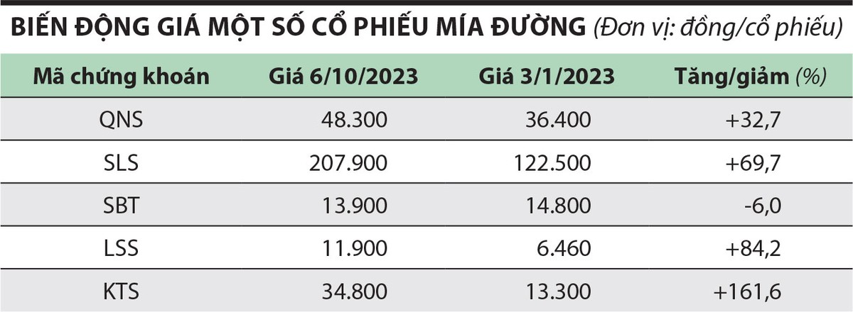 SSI Research cho biết, tháng 9/2023, giá đường trong nước tăng lên mức 22.300 đồng/kg, tăng 13% so với cùng kỳ năm ngoái và tăng 23% so với đầu năm. Hoạt động kinh doanh của nhiều doanh nghiệp mía đường ghi nhận kết quả tích cực.