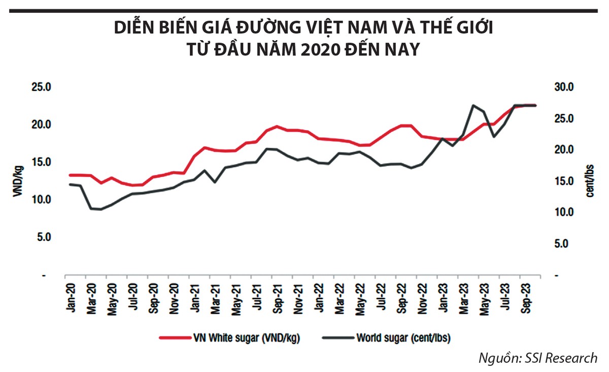 SSI Research nhận định, giá đường toàn cầu neo ở mức cao sẽ hỗ trợ tích cực cho kết quả kinh doanh của các doanh nghiệp mía đường. Giá đường nội địa và sản lượng tiêu thụ tăng sẽ tiếp tục thúc đẩy lợi nhuận của mảng đường trong thời gian tới. Giá đường trong nước có thể tiếp tục tăng ít nhất đến hết quý II/2024. Đường nhập khẩu sẽ chiếm hơn một nửa nguồn cung đường trong nước trong niên vụ 2023 - 2024, giảm từ mức 2/3 trong niên vụ 2022 - 2023.