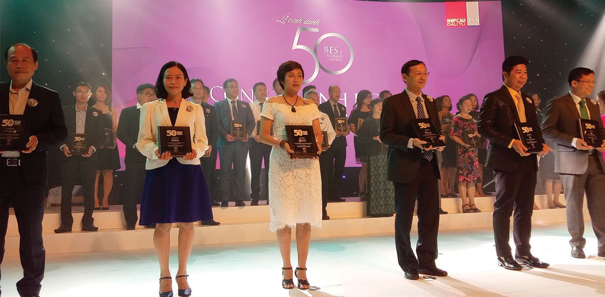 Phát Đạt xếp thứ 13/50 tại lễ trao giải Top 50 công ty kinh doanh hiệu quả nhất Việt Nam (Đại diện Phát Đạt thứ 3 từ trái qua lên nhận giải thưởng)