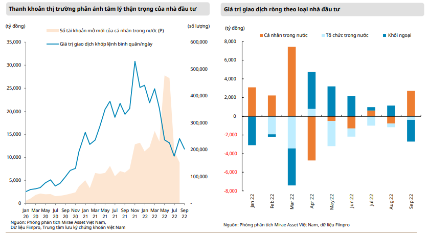 Theo quan điểm của Mirae Asset, VN-Index đã đối mặt với tình trạng bán tháo hoảng loạn, phần lớn là do tâm lý tiêu cực đến từ quyết định tăng lãi suất của Fed và Ngân hàng Nhà nước, cũng như triển vọng kinh tế toàn cầu ảm đạm. Hơn nữa, tâm lý thị trường cũng phản ánh căng thẳng địa chính trị gia tăng khi Nga gần đây đã tuyên bố sáp nhập 4 khu vực của Ukraine.