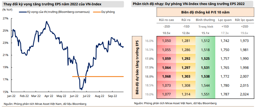 Nếu các yếu tố vĩ mô của thế giới và trong nước không diễn biến xấu hơn, Mirae Asset vẫn giữ nguyên dự báo tăng trưởng EPS năm 2022 là 17,5% so với cùng kỳ, so với mức kỳ vọng của thị trường là 22%.