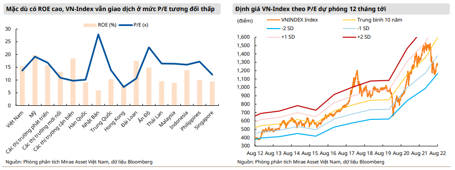 Theo Bloomberg consensus, P/E dự phóng cuối năm của thị trường Việt Nam so với các nước trên thế giới vẫn còn thấp, đặt trong bối cảnh thị trường đang được kỳ vọng có mức tăng trưởng EPS gần 29% so với cùng kỳ trong năm 2022 và tiếp tục tăng gần 17% so với cùng kỳ trong năm 2023.