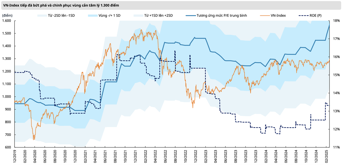 VN-Index dự kiến sẽ tiếp tục tăng trưởng và hướng về mốc 1.330 điểm trong bối cảnh chịu ảnh hưởng bởi các tin tức trái chiều đến từ thị trường quốc tế xoay quanh thương chiến. Tuy nhiên, áp lực chốt lời đến từ nhóm ngân hàng sẽ hình thành các nhịp điều chỉnh trong ngắn hạn nhằm tạo ra vùng cân bằng mới của VN-Index tại các vùng đỉnh cũ, đặc biệt trong bối cảnh VN-Index vẫn đang giao dịch tại vùng kháng cự 1.300 – 1.330 điểm hình thành từ năm 2022. Vùng hỗ trợ mới của chỉ số NÀY dự kiến sẽ hình thành quanh vùng 1.280 điểm.
