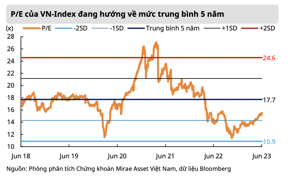 Về mặt định giá, P/E của VN-Index đã tăng từ mức trung bình 5 năm trừ hai độ lệch chuẩn (11 lần) vào tháng 11/2022 lên 15,3 lần vào cuối tháng 6/2023.