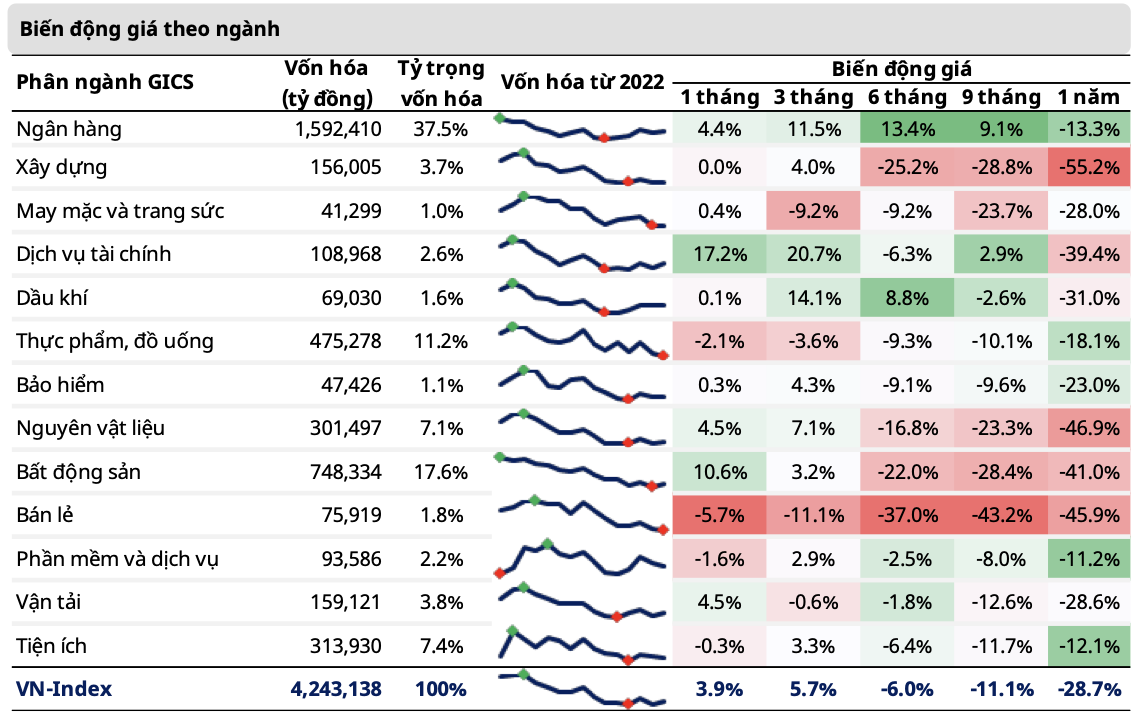 Nhờ chính sách nới lỏng tiền tệ gần đây của NHNN, các ngành nhạy cảm với lãi suất đã dẫn dắt đà phục hồi của VN-Index. Dịch vụ tài chính (tăng 17,2% so với tháng trước), Bất động sản (tăng 10,6%), Nguyên vật liệu (tăng 4,5%) và Ngân hàng (tăng 4,4%) tăng tốt trong tháng 3. Ngoài ra, Vận tải có mức tăng 4,5% nhờ sự hồi phục của ngành du lịch và chính sách mở cửa trở lại của Trung Quốc.