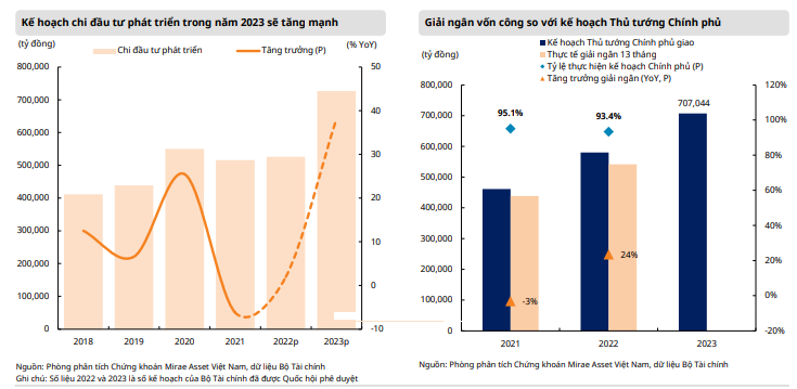 Theo Mirae Asset, trong bối cảnh hiện tại, Chính phủ được kỳ vọng sẽ tiếp tục thúc đẩy đầu tư công trong năm 2023 để không chỉ hỗ trợ tăng trưởng GDP của Việt Nam (chiếm gần 10% GDP danh nghĩa), mà còn nâng cao năng lực cạnh tranh thu hút FDI trong bối cảnh chuỗi cung ứng toàn cầu vẫn đang tái cấu trúc. Do đó, giải ngân công sẽ là động lực tăng trưởng chính trong thời gian tới.