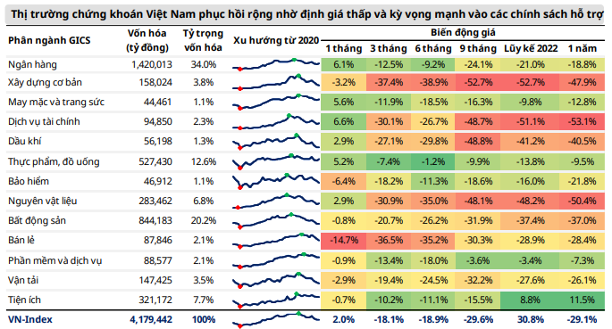 Nhờ đó, cuối tháng 11, các ngành Ngân hàng, Dịch vụ tài chính và Bất động sản đã dẫn dắt thị trường chung phục hồi mạnh mẽ. Các chuyên gia hy vọng, sự hạ nhiệt của giá hàng hóa và lạm phát của Mỹ sẽ hỗ trợ cho kỳ vọng các đợt tăng lãi suất chậm lại. Đây sẽ là yếu tố hỗ trợ quan trọng để kéo dài đà phục hồi của thị trường chứng khoán.