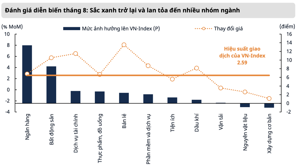 Kết thúc tháng 8, VN-Index đóng cửa tại 1.283,87 điểm với mức tăng hơn 32 điểm (tăng 2,59% so với tháng trước) với chuỗi tăng điểm kéo dài 3 tuần liên tiếp.