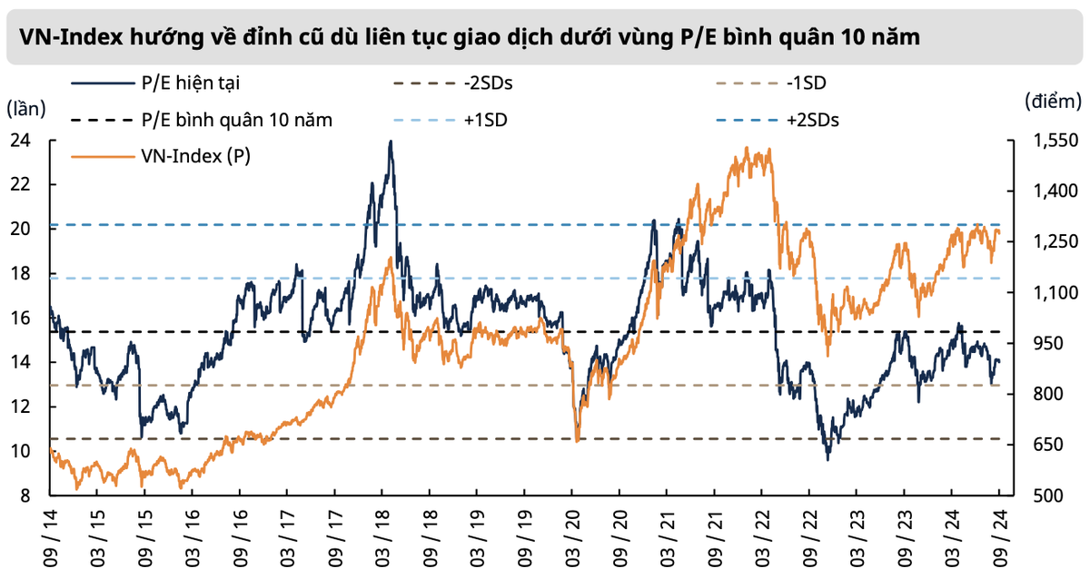 Trong trung và dài hạn, nhóm phân tích Mirae Asset cho rằng, thị trường vẫn chưa có đủ dữ kiện để đánh giá thị trường sẽ sớm bước sang giai đoạn đảo chiều của xu hướng, và VN- Index có khả năng vẫn sẽ hướng về cột mốc tâm lý 1.300 điểm trong bối cảnh định giá theo P/E của VN-Index vẫn duy trì ở mức tương đối hấp dẫn (giao dịch dưới vùng bình quân 10 năm gần nhất).