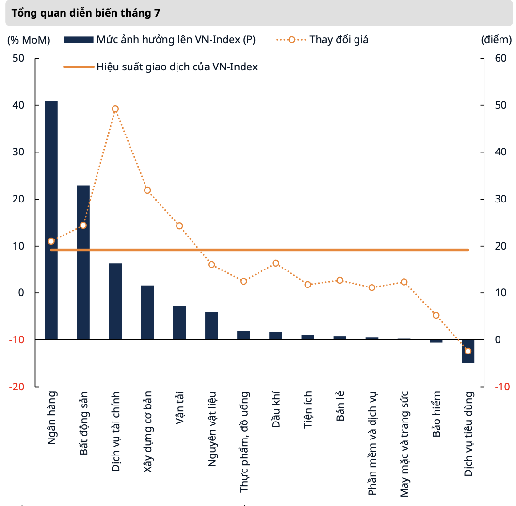Về dòng vốn, khối ngoại mua ròng 8.700 tỷ đồng trong tháng 7 và lũy kế từ đầu năm bán ròng 31.100 tỷ đồng. Dòng tiền ngoại tập trung giải ngân vào nhóm chứng khoán, ngân hàng và bất động sản; trong khi bán ròng nhóm vận tải và nguyên vật liệu. Nhóm tự doanh ghi nhận phân hóa khi bán ròng tổng cộng 409 tỷ đồng, chủ yếu tại ngân hàng và ETF, đồng thời mua ròng ở nhóm F&B và xây dựng.