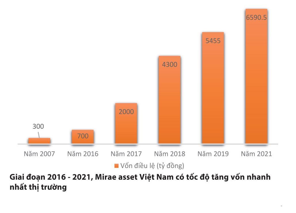 Khi nhận ra cơ hội thị trường, Mirae Asset thực hiện các kế hoạch một cách quyết liệt, chỉ trong 4 năm liên tiếp 2016-2019, Mirae Asset Việt Nam có thể được xem là CTCK có tốc độ tăng vốn nhanh, mạnh nhất trên thị trường. Cụ thể, từ mức 700 tỷ đồng năm 2016, lên 5.455 tỷ đồng năm 2019 và đến cuối năm 2021, vốn điều lệ của Mirae Asset là 6.590,5 tỷ đồng. Nhìn kỹ lại thời điểm Công ty có các bước tăng trưởng mạnh mẽ là từ năm 2016 - đón đầu làn sóng đầu tư từ Hàn Quốc vào Việt Nam, Mirea Asset đã có bước đi táo bạo nhưng không kém phần nhanh nhạy với việc đạt được thoả thuận mua lại toàn bộ cổ phần từ đối tác nội địa, chính thức sở hữu 100% vốn tại Công ty.