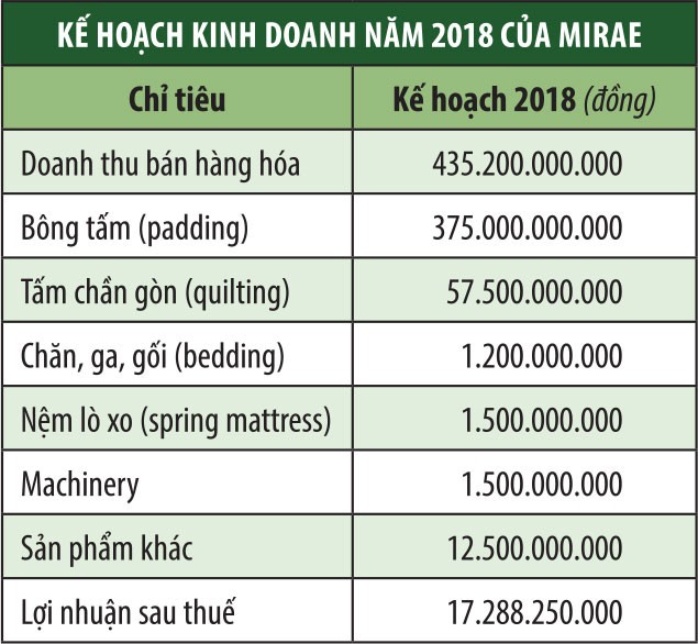 Theo kế hoạch, năm 2018, Mirae đặt mục tiêu doanh thu bán hàng 435,2 tỷ đồng, tăng 14,6% so với thực hiện năm 2017, trong đó bông tấm đóng góp 375 tỷ đồng, chiếm 86%. Đây là mặt hàng chủ lực, chiếm trên 80% doanh thu hàng năm của Công ty. Kế hoạch lợi nhuận sau thuế năm 2018 là 17,3 tỷ đồng, hơn gấp đôi năm 2017. Kế hoạch này chưa bao gồm phần công suất dự kiến gia tăng thêm 15% từ quý III/2018.