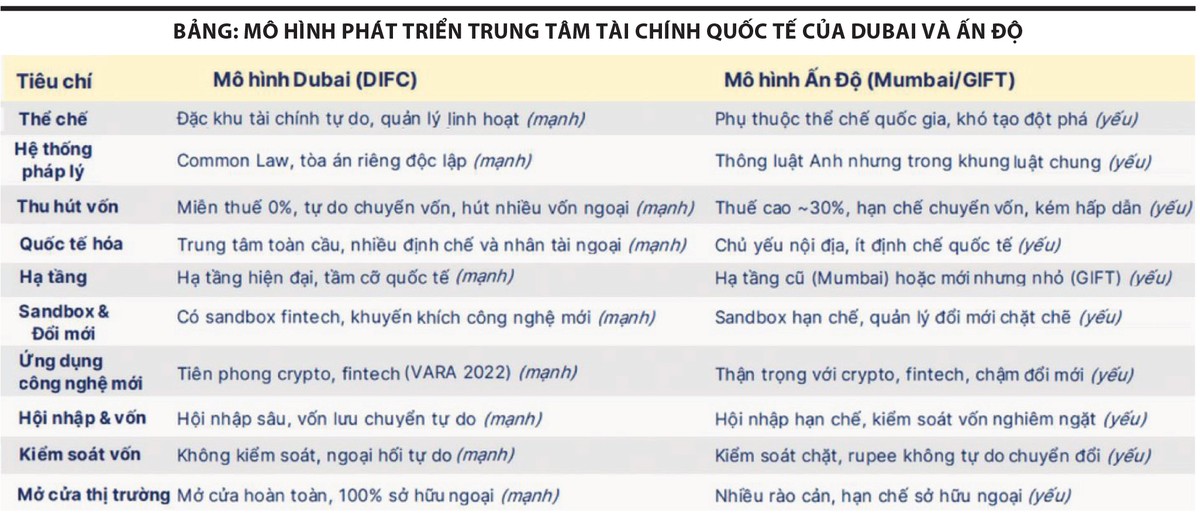 Để xác định hướng đi phù hợp, Việt Nam đang tham khảo các mô hình trung tâm tài chính quốc tế như Dubai (với Trung tâm Tài chính Quốc tế Dubai - DIFC) và Ấn Độ (với Mumbai và đặc khu tài chính GIFT City). Hai mô hình này đại diện cho hai cách tiếp cận trái ngược (xem bảng).