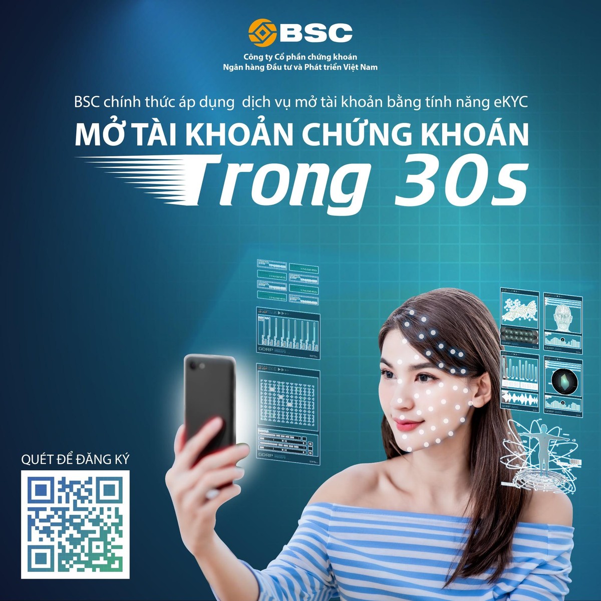 Mở tài khoản thông qua phương thức eKYC, nhà đầu tư sẽ được cung cấp đầy đủ các dịch vụ tiện ích trực tuyến hiện đại mà BSC đang cung cấp như các sản phẩm tài chính đa dạng, lựa chọn môi giới, tư vấn đầu tư online và nhận hỗ trợ từ các điểm giao dịch của BSC trên toàn quốc.