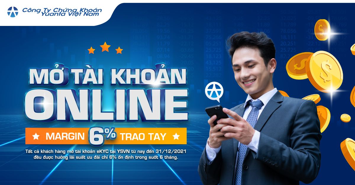Theo đó, trong thời gian trên, khi mở mới tài khoản trực tuyến eKYC tại Yuanta Việt Nam, khách hàng sẽ được hưởng lãi suất vay ưu đãi chỉ 6%/năm, ổn định trong 6 tháng. Sau khoảng thời gian nhận mức ưu đãi 6% đến 15/4/2022, khách hàng sẽ tiếp tục hưởng margin chỉ từ 6,8%/năm theo quy định ưu đãi lãi suất của Yuanta Việt Nam.