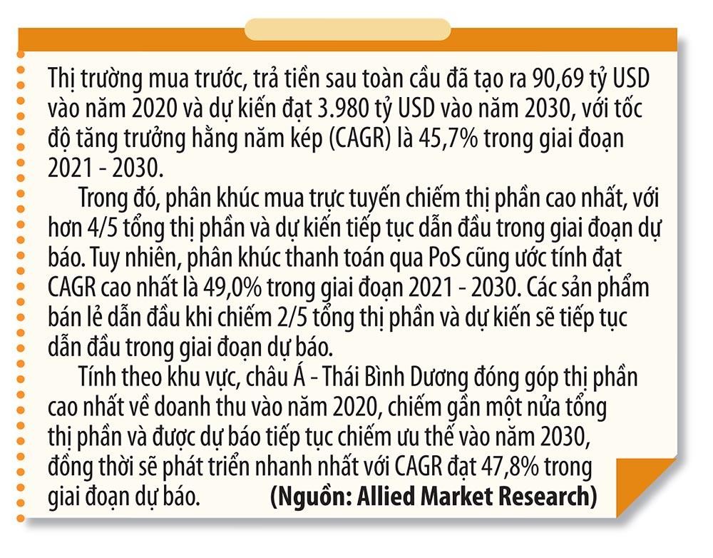 Hiện nay, trên thị trường có 2 mô hình kinh doanh dịch vụ mua trước, trả sau, gồm mô hình thu lãi, phí từ người dùng (thẻ tín dụng, cho vay trả góp, Momo, TPBank, Kredivo, Akulaku, paylater.vn...) và mô hình miễn lãi, phí cho người dùng, với nguồn thu chính là từ đối tác bán lẻ, như Klarna, Afterpay, Fundiin.