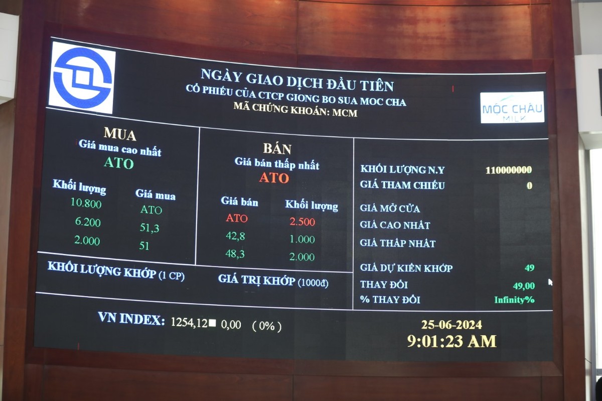 Công ty CP Giống bò sữa Mộc Châu (Mộc Châu Milk) chính thức đưa 110.000.000 cổ phiếu với mã chứng khoán MCM vào giao dịch tại Sở Giao dịch Chứng khoán Thành phố Hồ Chí Minh, với giá tham chiếu chào sàn trong ngày giao dịch đầu tiên là 42.800 đồng/cổ phiếu, tương ứng định giá khoảng 4.700 tỷ đồng.