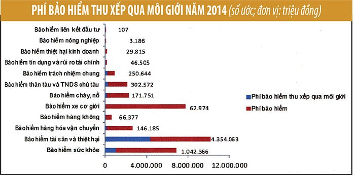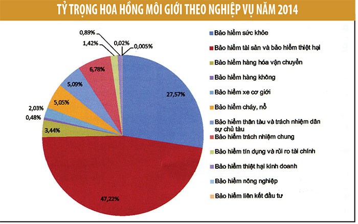 Về doanh thu hoa hồng môi giới bảo hiểm, năm 2014, con số này đạt gần 492 tỷ đồng, tăng 10% so với năm 2013. Hoa hồng môi giới bảo hiểm vẫn chủ yếu tập trung ở các nghiệp vụ: bảo hiểm tài sản và thiệt hại (hơn 47%), bảo hiểm sức khỏe (gần 28%), bảo hiểm trách nhiệm chung (6,78%).