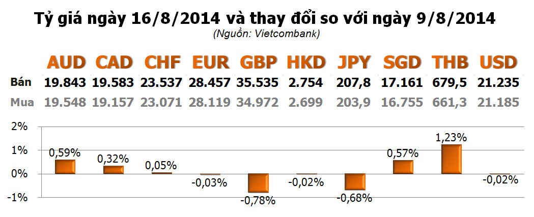 Với các ngoại tệ khác, có tăng, có giảm. Ở chiều tăng, dẫn đầu là THB với 1,23%; tiếp đến là AUD với 0,59%; rồi đến SGD với 0,57%; CAD với 0,32%. Bên chiều giảm, mạnh nhất là GBP với -0,78%; tiếp theo là JPY với -0,68%.