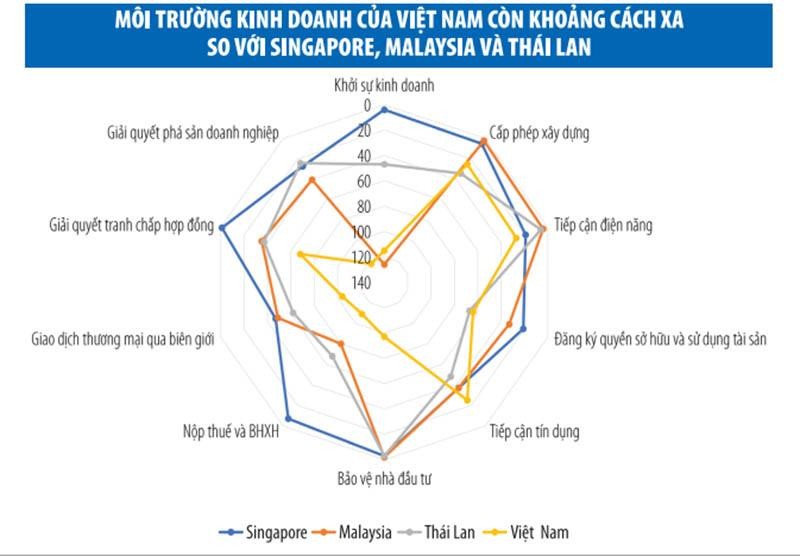 Nhưng tổng thể, môi trường kinh doanh Việt Nam đang đứng thứ 70/190, xếp thứ 5 trong khu vực ASEAN, sau Singapore (2/190), Malaysia (12/190), Thái Lan (21/190) và Brunei (6/190). Như vậy, mục tiêu đạt thứ hạng trong 30 quốc gia hàng đầu về môi trường kinh doanh của Dự thảo Chiến lược Phát triển kinh tế - xã hội 10 năm 2012 - 2030 trình Đại hội Đảng lần thứ XIII là vô cùng thách thức.