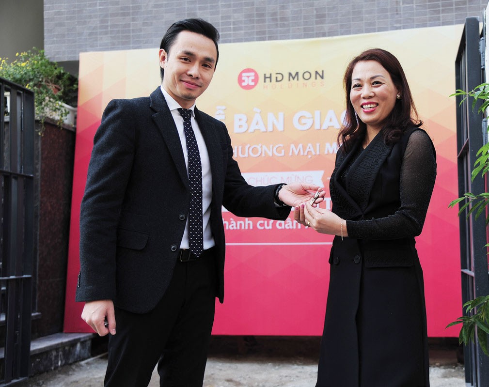 Ông Nguyễn Anh Tuấn, Tổng giám đốc HD Mon Holdings - Công ty mẹ của HD Mon Real Estate - trao tận tay chị Thủy bộ chìa khóa sở hữu căn nhà phố thương mại đầu tiên