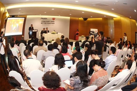 Lãnh đạo Tập đoàn Kinh Đô và Mondelèz International tại lễ công bố thông tin sáng 11/11/2014 - ảnh Lê Toàn
