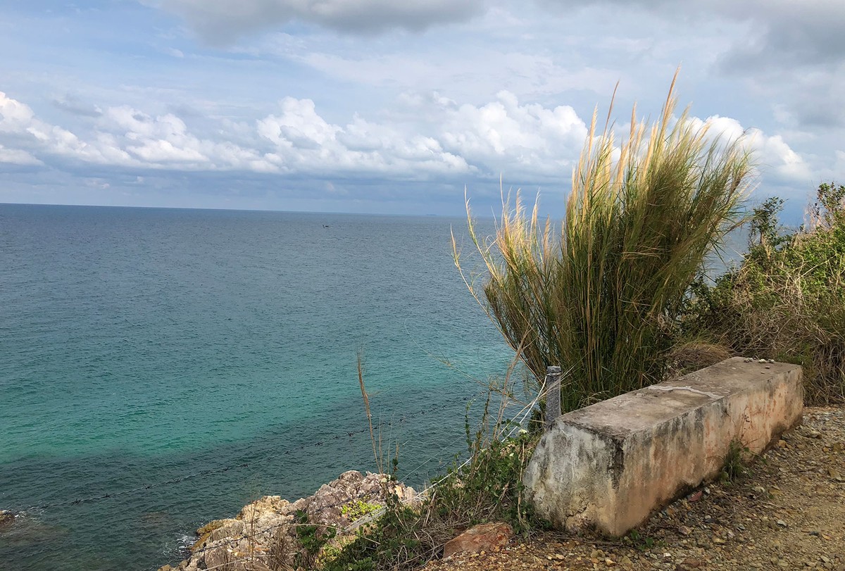 Ngày thứ 2, chúng tôi chọn phương tiện di chuyển bằng xe máy để khám phá hòn Lớn. Những người thích phượt như chúng tôi đã bị hấp dẫn bởi những con đường trải nhựa từ thời Pháp, một bên là biển, một bên là núi đá cheo leo. Bao quanh hòn Lớn là tràn ngập sắc màu xanh của biển, của trời, hòa quyện với màu tím của những đồi hoa mua biêng biếc, màu trắng của những bong lau lướt phướt lối đi…