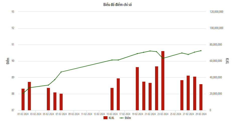 Chỉ số UPCoM-Index có xu hướng tăng dần từ đầu tháng và đóng cửa phiên giao dịch cuối tháng đạt mức cao nhất là 90,63 điểm, tăng 3,1% so với cuối tháng 1/2024.