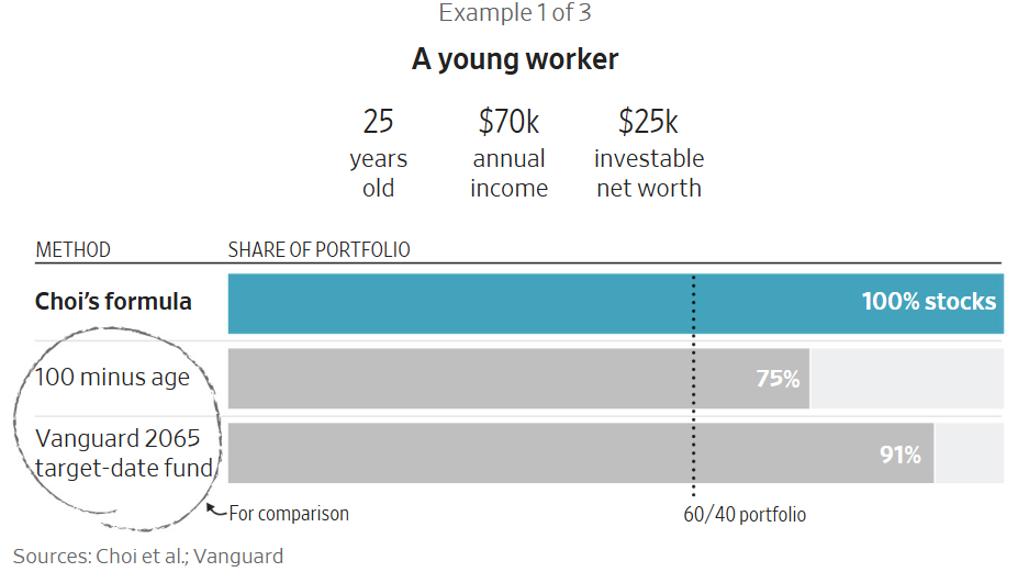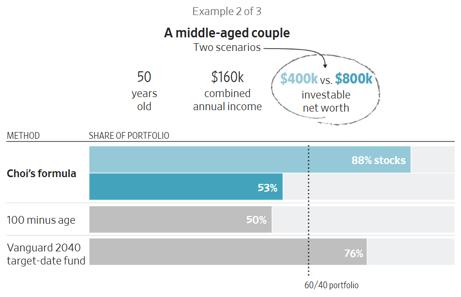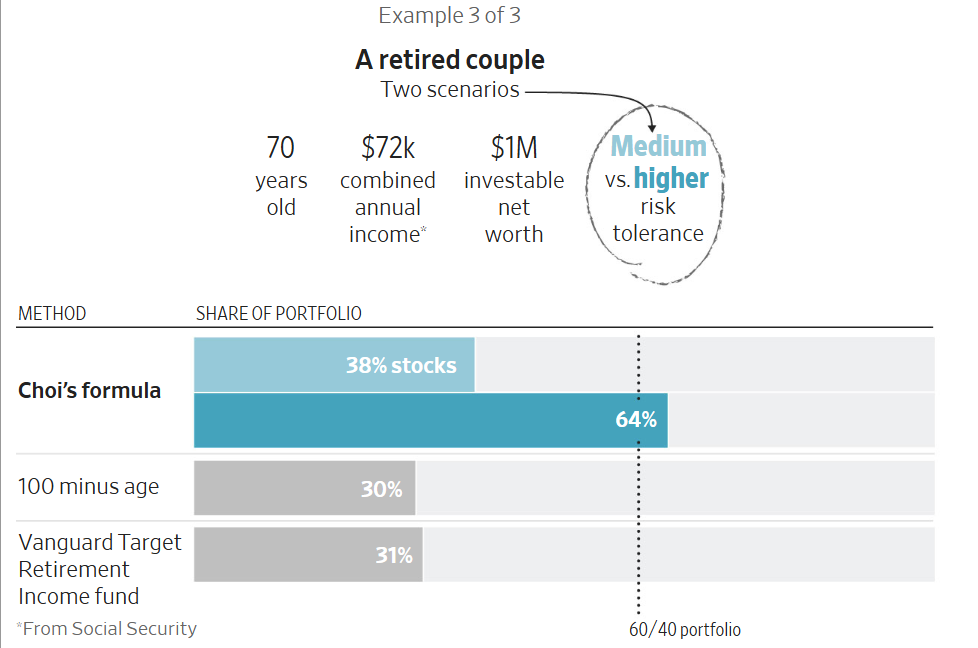 Giáo sư tài chính James Choi của Đại học Yale gần đây đã xây dựng một công thức gợi ý cách phân bổ tài sản dựa một phần vào tuổi tác, thu nhập, tiền tiết kiệm và mức độ chấp nhận rủi ro của mỗi người. Công thức này xuất phát từ một nghiên cứu ông đồng tác giả năm ngoái và được điều chỉnh lại cho The Wall Street Journal.