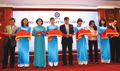 Lãnh đạo HOSE cùng các vị quan khách cắt băng khai trương bộ chỉ số chứng khoán mới