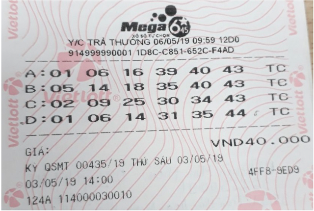 Đây là vị khách đã may mắn trúng thưởng trong kỳ quay 435. Tấm vé của bà H. có bộ số gồm: 01 – 06 – 14 – 31 – 35 – 44. Bộ số này đã trùng với kết quả của giải độc đắc.
