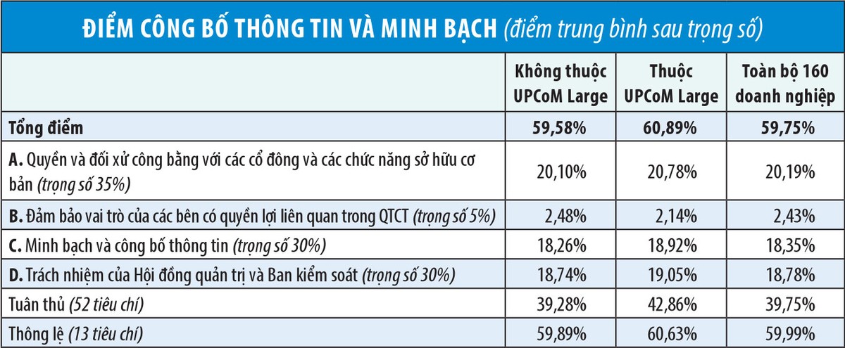 Trong đó, các doanh nghiệp thuộc rổ chỉ số UPCoM Large có điểm trung bình cao hơn, đạt 60,89% điểm (UPCoM Large bao gồm 52 doanh nghiệp có vốn chủ sở hữu từ 1.000 tỷ đồng trở lên, trong đó có 21 doanh nghiệp đáp ứng điều kiện của chương trình đánh giá là có thời gian đăng ký giao dịch trước ngày 20/4/2017 cũng như không bị tạm ngừng giao dịch/hạn chế giao dịch).