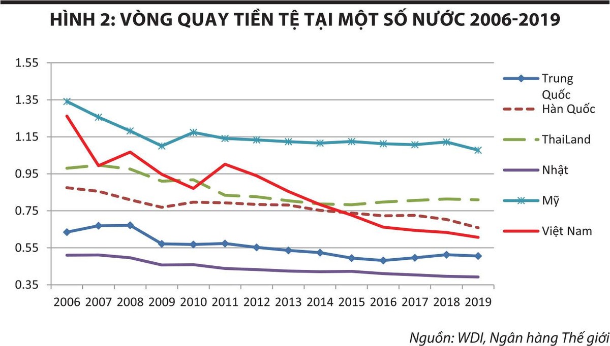 Điều đáng ngạc nhiên đó là vòng quay tiền tệ của hầu hết các nước đều giảm trong hơn 10 năm qua, đặc biệt là tại Việt Nam - vòng quay tiền tệ giảm mạnh nhất. Hiện tượng vòng quay tiền tệ giảm (người dân thích giữ tiền hơn là tiêu dùng) cũng giải thích tại sao cung tiền tăng không tạo ra lạm phát.